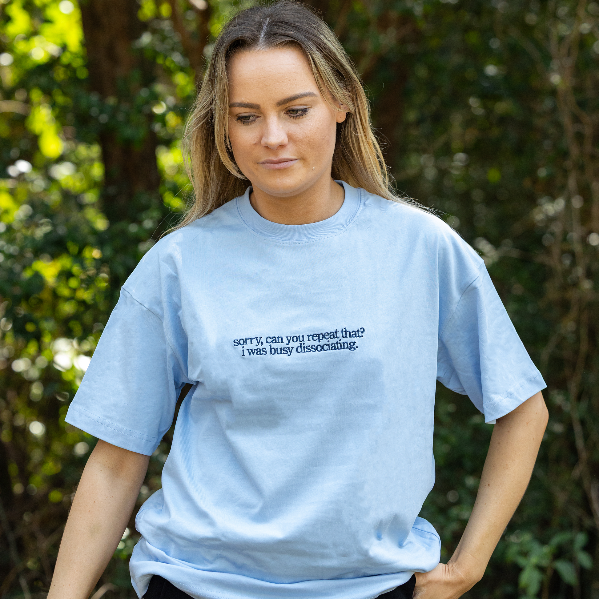 Because sometimes the lights are on but nobody’s home. The ‘Sorry, Can You Repeat That? I Was Busy Dissociating’ Tee is soft, oversized, and just a little too relatable.
